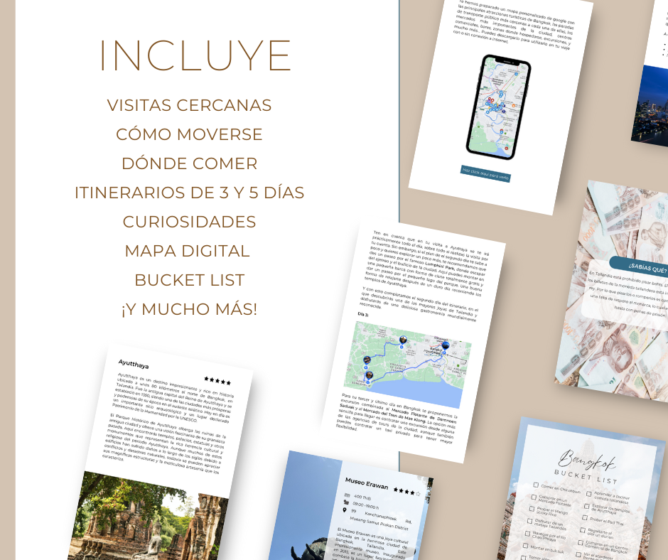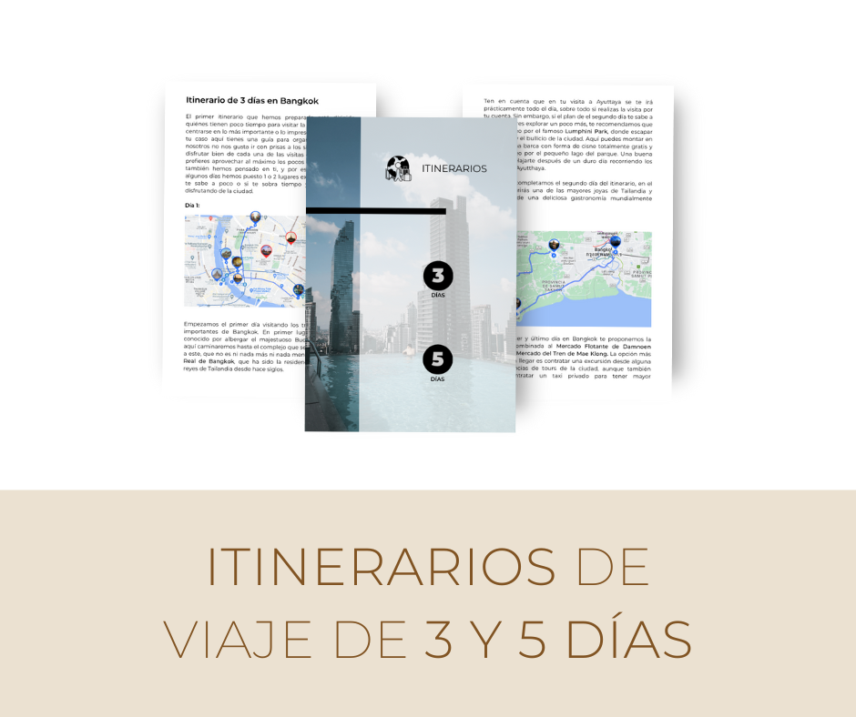 No dejes que la sobrecarga de información te impida disfrutar de tu viaje. Simplifica la planificación y disfruta al máximo de tu tiempo en Bangkok con nuestra guía de viaje digital. Haz clic en "¡Quiero esto!" ahora mismo y comienza tu aventura sin preocupaciones en esta ciudad asombrosa. ¡Tu viaje de ensueño a Bangkok está a solo un clic de distancia!